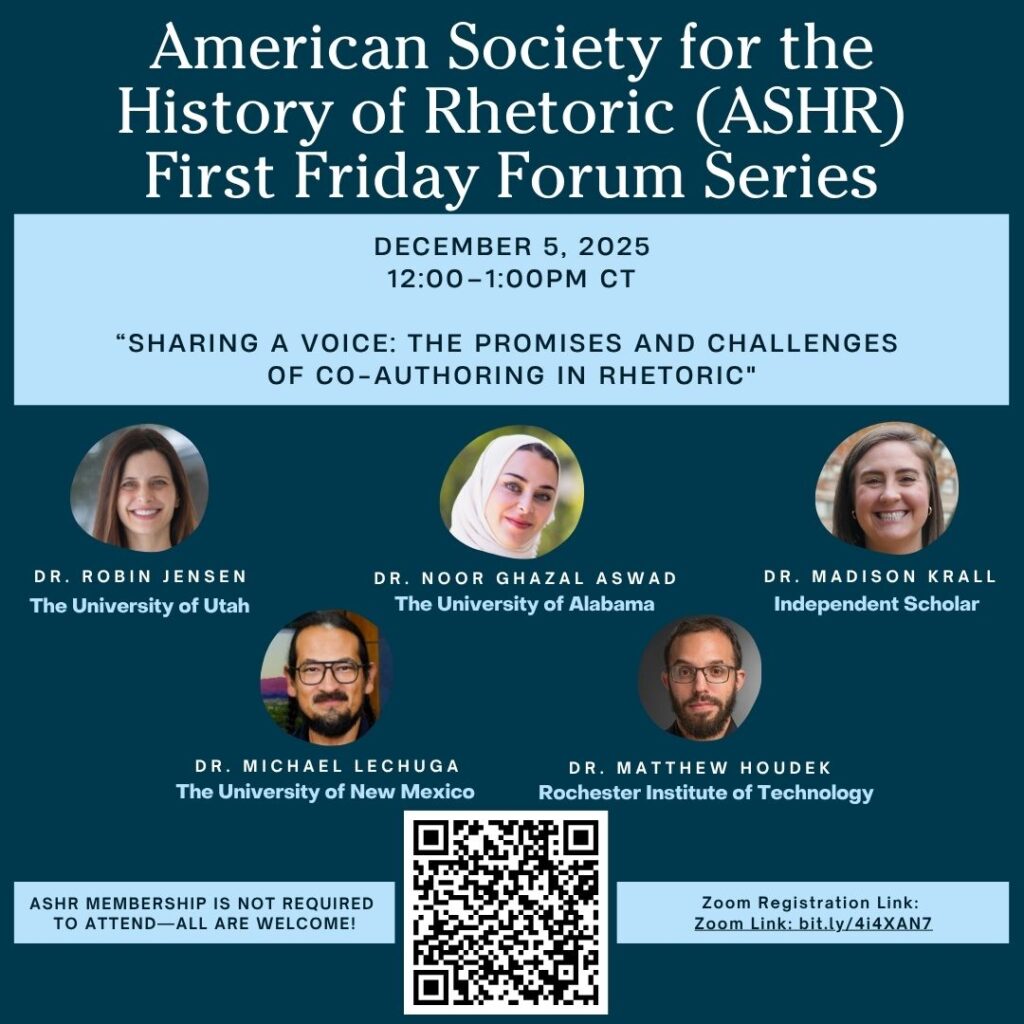 About the ASHR First Friday Forum Series: Inspired by the classical conception of the forum as an intellectual gathering place, ASHR’s “First Friday Forum” series promotes educational programming, professional development, and an inclusive, collaborative virtual community. It is our hope that this virtual space will foster dynamic, cross-disciplinary scholarly engagement for those interested in reexamining and reimagining the various histories of rhetoric across all periods, languages, cultures, and modes of performance. The Fall 2025 “First Friday Forum” series will focus on key questions related to the research and teaching of the history of rhetoric / rhetorical history. These virtual gatherings will take place on October 3, November 7, and December 5, 2025, from 12:00-1:00pm Central Time via Zoom.